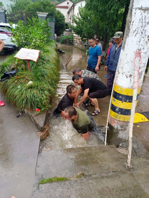 為了盡快解決這個問題,墨城塢村黨支部書記壽建兵、村副主任(鎮人大主席團成員)壽迪龍和胡劍慧一起想到了用竹竿疏通的辦法。“就是試試看!總比一直堵著強!”說干就干,壽建兵帶頭與村里的黨員干部一起下水疏通管道。10多個人分成兩組從涵管兩頭對向疏通,村干部還爬進了涵管里面進行疏通。經過2個小時的努力,堵塞的涵管已重新暢通,內澇水位明顯下降。