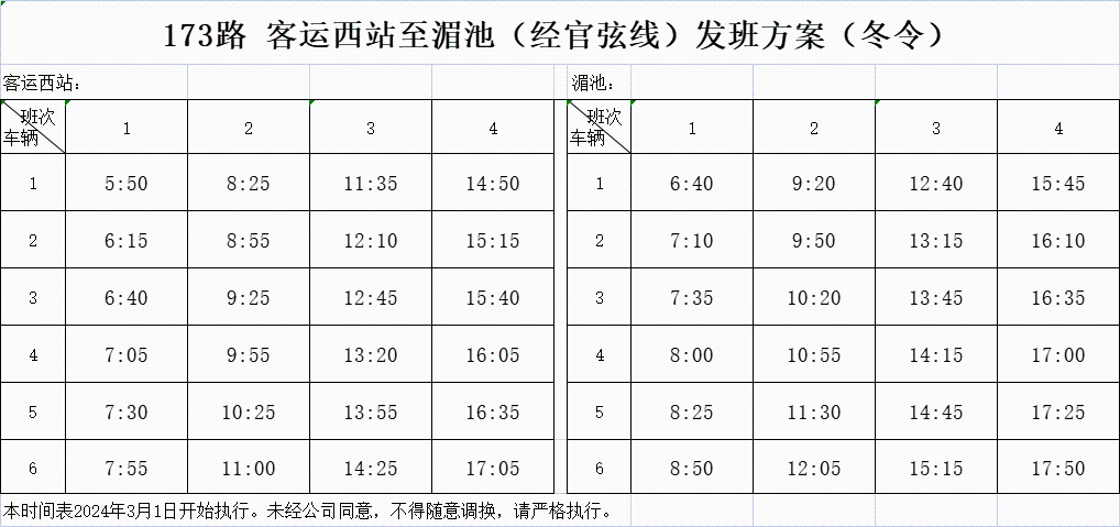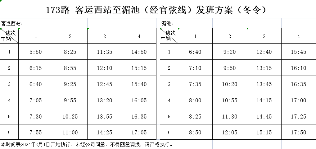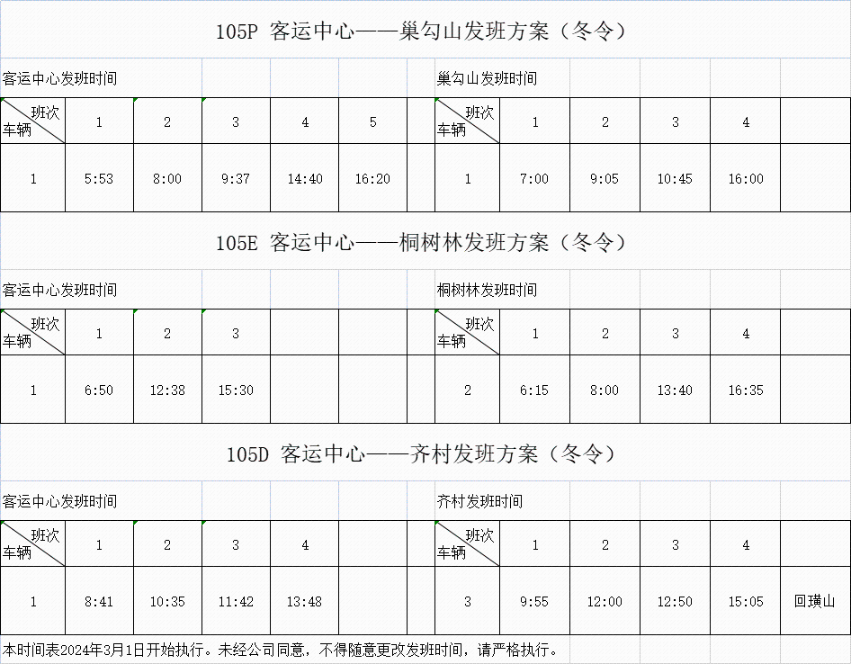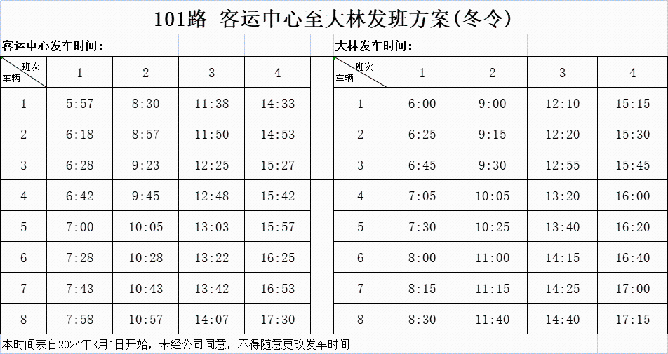 2024年3月1日起,城鄉公交部分班車發班時間調整,具體如下:
