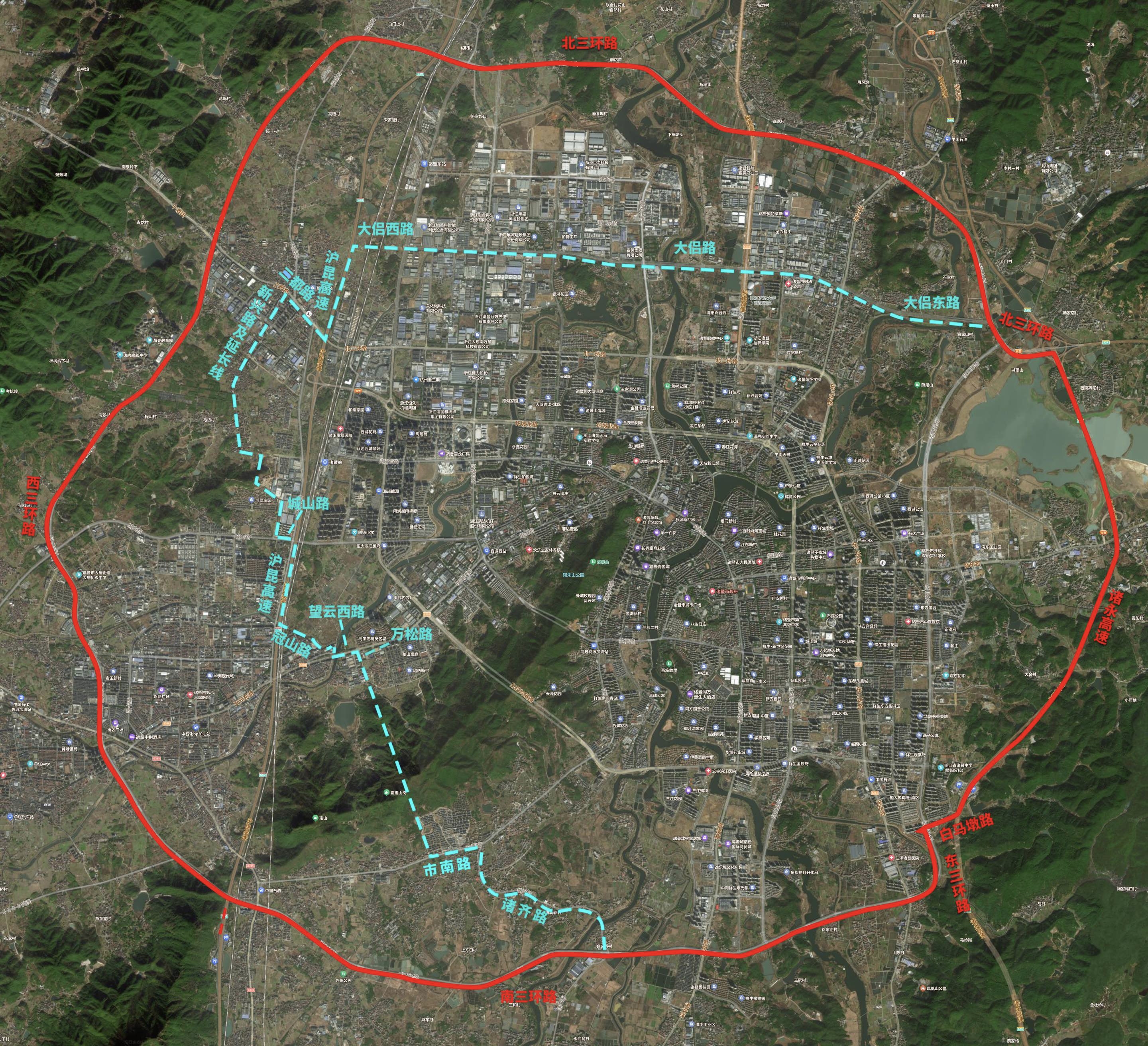 原“雙禁”范圍:東至諸永高速-白馬墩路—東三環路,南至市南路—諸齊線—南三環路(包括祥生江南里),西至三都路—新興路及延長線—滬昆高速(包含華海家園、明聯小區、民生花園),北至大侶路。