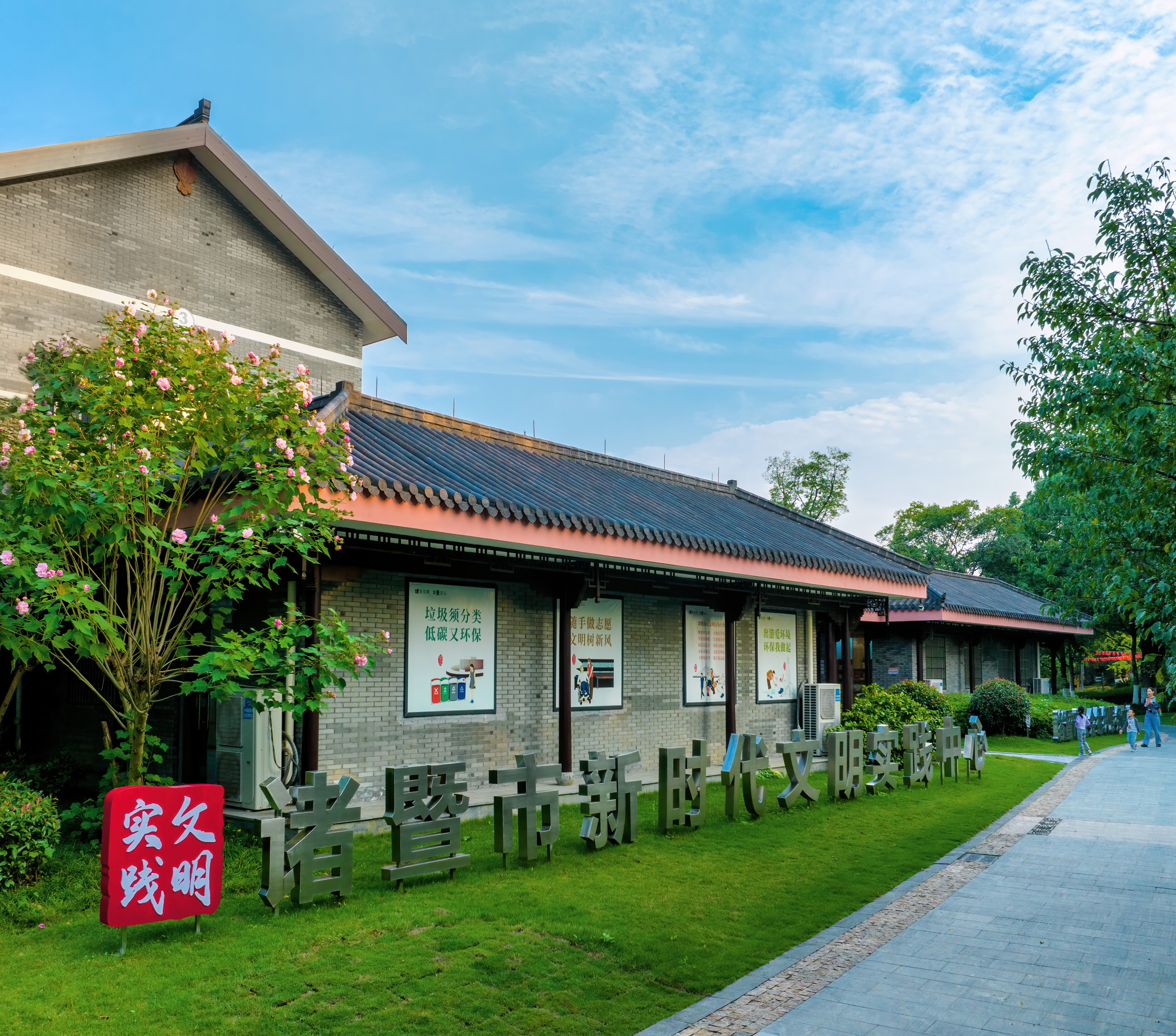 諸暨市新時代文明實踐中心位于市民公園3號樓,占地面積2800平方米,與市社會組織服務中心一體化運行,內設展陳展示區、志愿團隊入駐區、宣講直播間、慈善生活館等特色場景,配備公益課堂、書畫室、浣江書房、愛心驛站等功能場所。中心是全市新時代文明實踐工作的“指揮部”,負責統籌、協調、聯絡、督促全市文明實踐工作,確保文明實踐工作穩步推進,落地生根。中心是全市文明工作的重要展示窗口,設有“收獲”“實踐”“培育”“創建”等板塊,全方位、深層次地展呈現諸暨文明工作的發展歷程、特色品牌和各鎮街的文明風采。中心是文明實踐志愿團隊的孵化基地,現有入駐團隊11支,定期組織各類交流培訓活動,孵化了“莊園下鄉·青年共富”“藝路童行”“追‘楓’少年”等一批優秀項目。中心是周邊居民的文化樂園,常態開展宣傳宣講、文化文藝、傳統民俗、便民集市等實踐活動,滿足市民多樣化的精神文化需求。