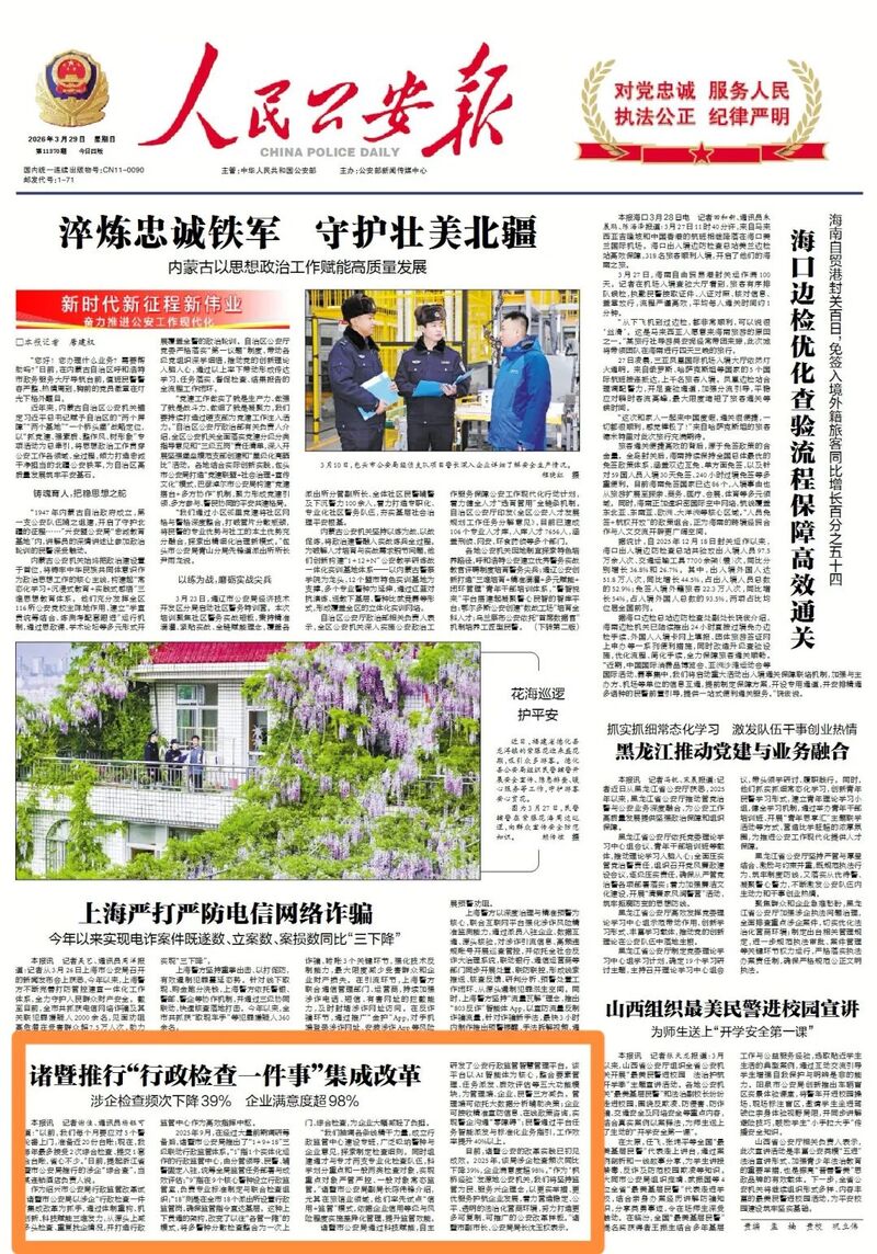 從體制重構的頂層設計到機制創新的精準施策,從科技賦能的智慧監管到警企攜手的良性互動,諸暨公安以涉企“行政檢查一件事”集成改革為抓手,用降頻次、提效能、優服務的組合拳,回應企業對法治化營商環境的深切期盼。近期,相關做法在《人民公安報》刊登,原文如下: